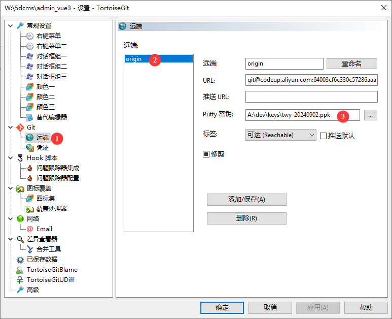 2. 在TortoiseGit(小乌龟git),默认情况,是使用“PuTTY/Plink”进行连接远端ssh的,在仓库目录右键,TortoiseGit子菜单组,设置,在“Git”->“远端”里,点击远端origin,右边的“Putty密钥”选择你想要使用的密钥,点击“应用”或者“确定”进行保存。