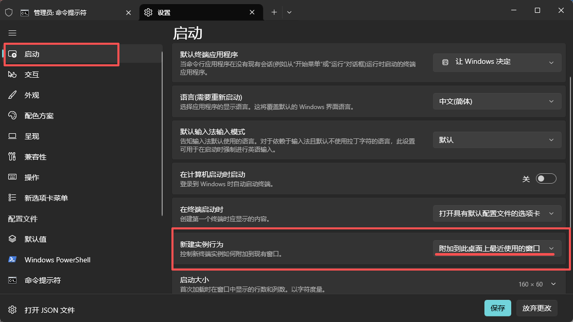 4. 保存设置并生效:点击设置页面底部的 “保存” 按钮,完成配置。之后无论通过何种方式新开 CMD(比如双击批处理文件、开始菜单打开 CMD 等),都会自动合并到之前打开的 Windows 终端窗口中,以新标签的形式呈现。